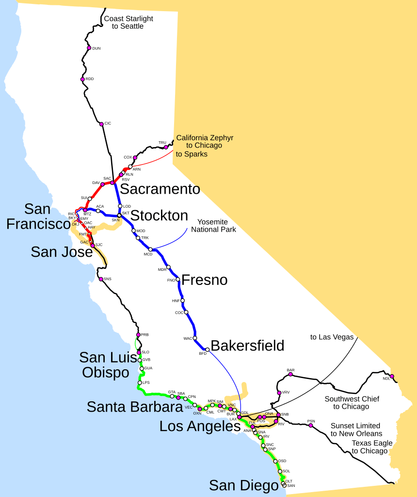 Before embarking, I thought I would be able to travel directly from San Jose Diridon Station to San Diego’s Sante Fe station, but I was amiss. It turns out that there’s no direct train route servicing between the Bay Area and San Diego. But not all was lost … for luckily, the state of California has more than just one Amtrak line. Let’s look at a map of lines !
