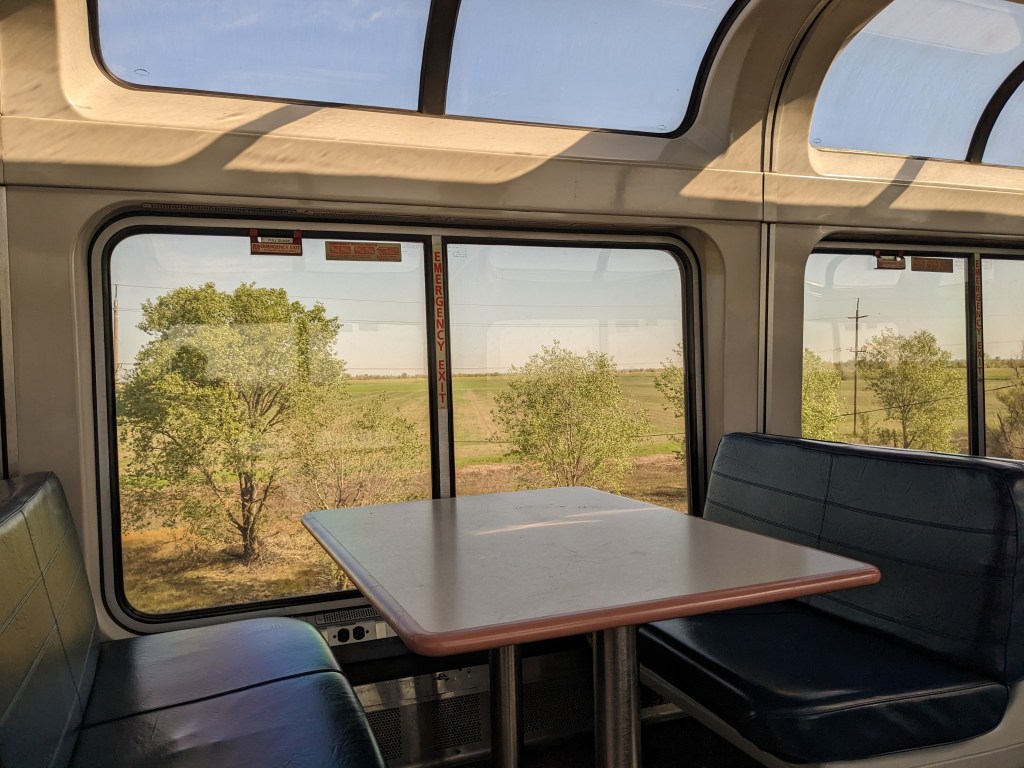 This trip segment was short-lived – I spent only a few hours in the morning taking in the splenetic, sunlight views from the observation deck and the dining cars. I woke up to the trains’ quotidian, hum-and-drum sound : constantly recurring on a rhythm beat. The breakfast meal involved a delicious 30-minute meal of Amtrak’s baked bread, healthy fruit, a grilled cheese sand-which, and coffee – a jam-packed All-American continent breakfast. I took the time to get my senses back to normalcy from a night of serious sleep deprivation ( it’s not easy to sleep on Amtrak coach) and then started collecting photos from the observation deck. Let me share them!